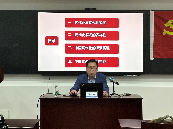 为深入开展学习贯彻习近平新时代中国特色社会主义思想主题教育,贯彻落实党的二十大精神,5月26日,成人漫画 硕士生党支部邀请 “三个一”联系人——马克思主义学院姜志强教授讲授《关于中国式现代化若干问题的思考》专题党课,成人漫画 硕士生党支部全体党员参加,党课由硕士生党支部书记王怡昕主持。