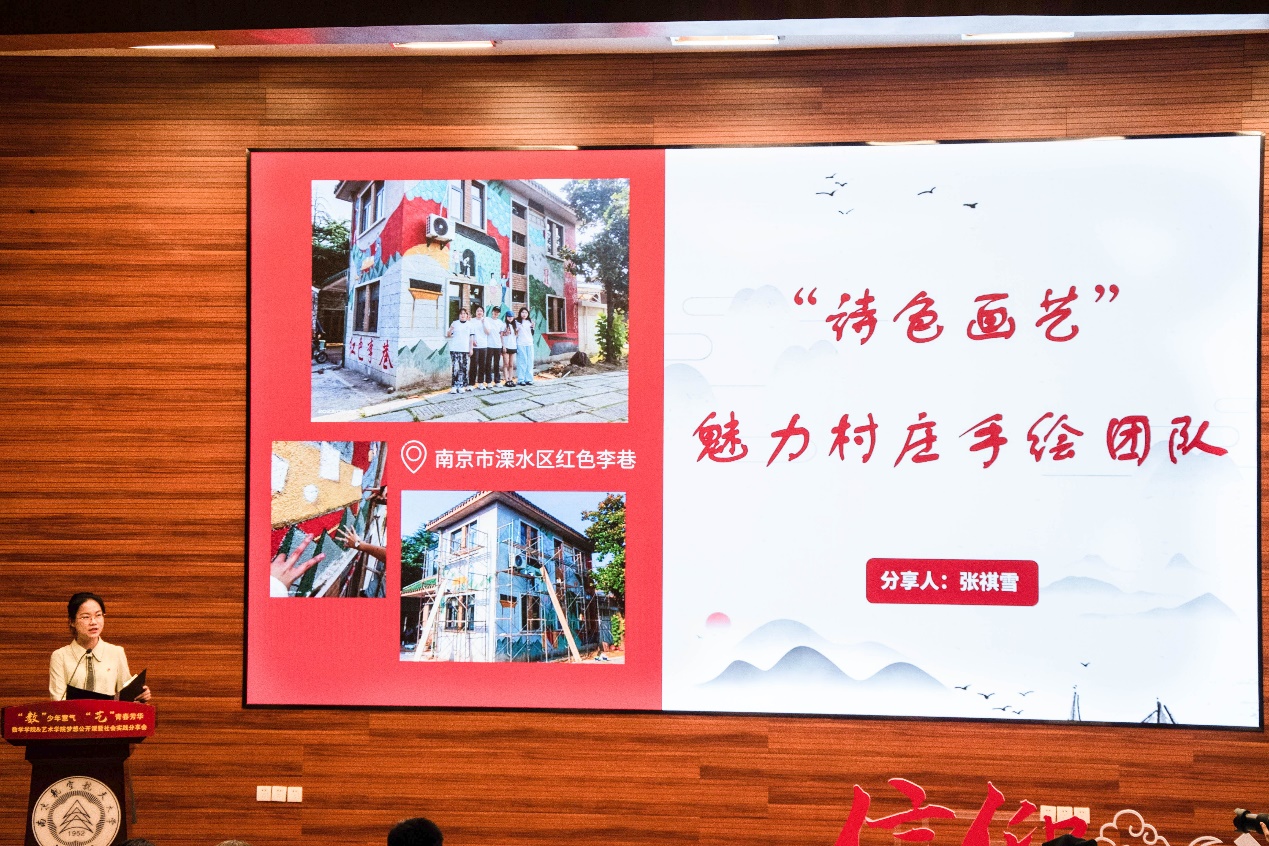 在“追寻足迹,绘述红色基因”篇章,艺术学院的学子们追寻红色历史,汲取奋进力量,担负时代赋予青年的责任。“笔尖上的红色文化”用手中的镜头和画笔描绘出一幅幅红色故事和革命文物图画;“诗色画艺”魅力村庄手绘实践团队探访江苏省南京市溧水区红色李巷,在接受红色洗礼的同时,绘制了66平方米的红色文化墙绘;“红色乡村的记忆档案”团队走进河南信阳新县田铺大湾村、山东临沂沂南县常山庄村等三县三村进行走访调研,了解了“红色资源+”乡村内源式发展等方面的建设逻辑,总结优势经验做法。