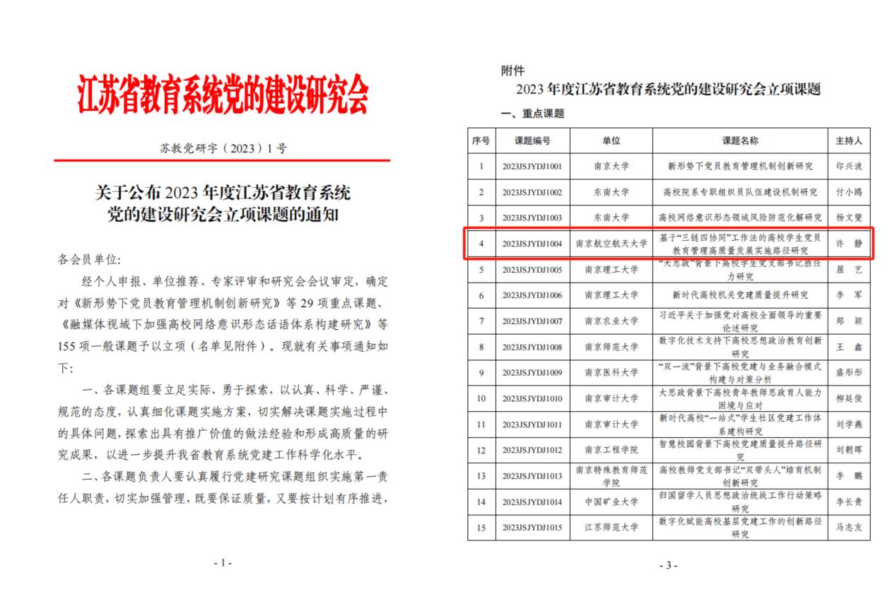 近日,江苏省教育系统党的建设研究会发布了《关于公布 2023 年度江苏省教育系统党的建设研究会立项课题的通知》,经个人申报、单位推荐、专家评审和研究会会议审定,成人漫画 申报的《基于“三链四协同”工作法的高校学生党员教育管理高质量发展实施路径研究》获重点课题立项(29项)。
