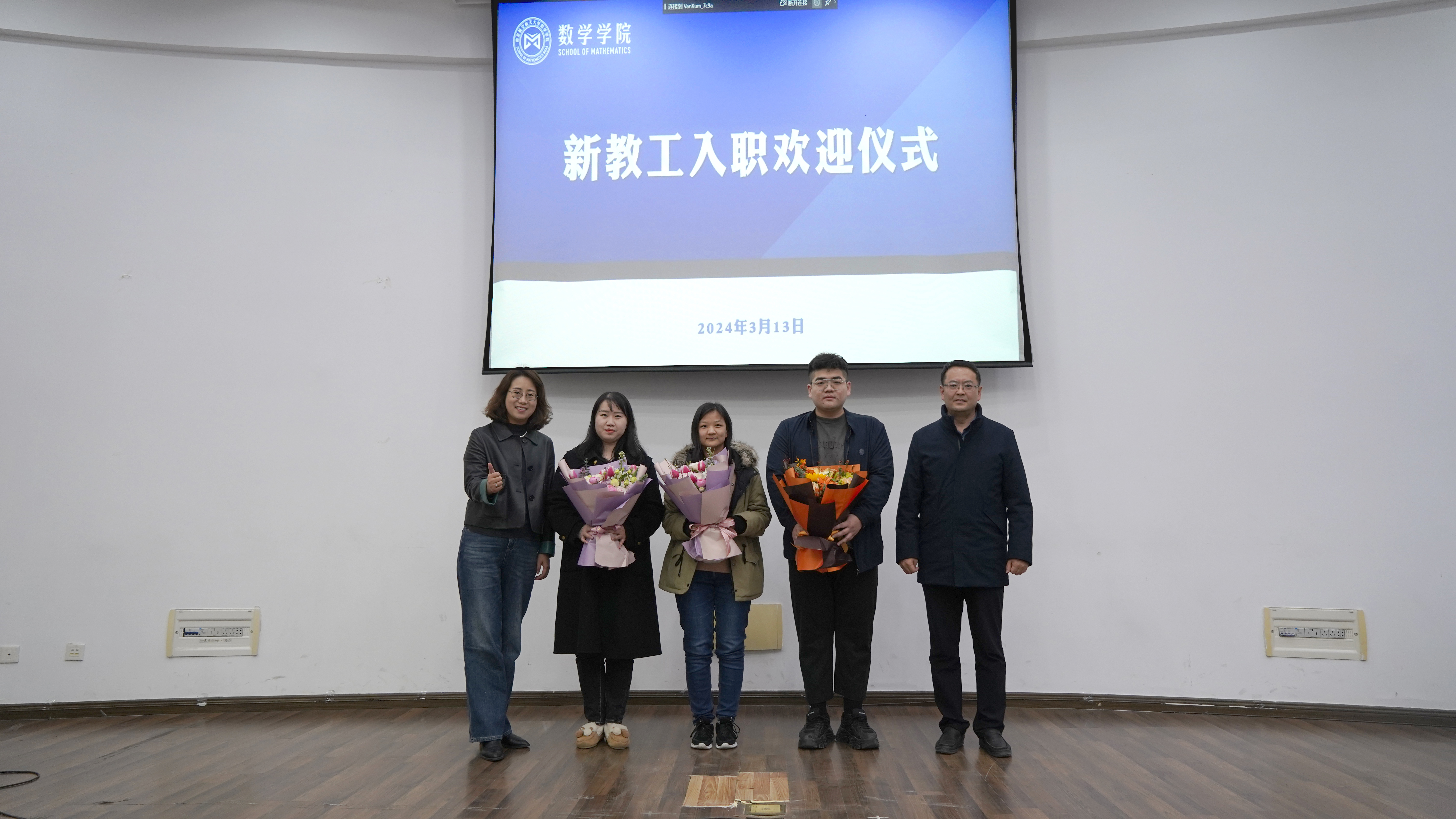会上,学院还举行了新教职工入职见面仪式,对张鹤千、贺婕、佟贺阳等三名新教师入职学院表示热烈欢迎,许静、王春武为他们佩戴院徽,并送上鲜花。
