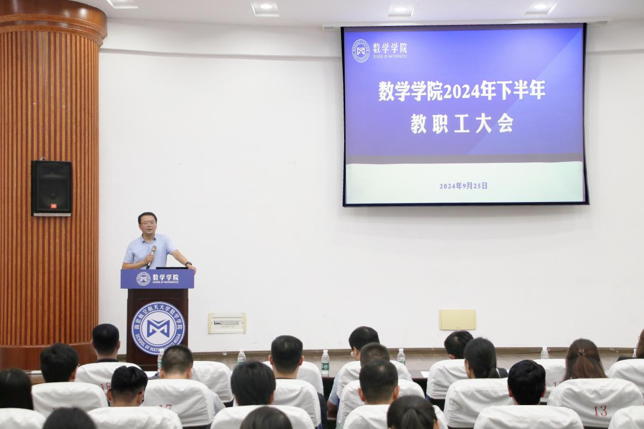 学院党委书记许静传达了全国教育大会精神以及校党委书记甄良在干部教师大会上的重要讲话。她指出,学院上半年以开展党纪学习教育为主线,强化政治赋能、组织赋能、文化赋能,党建示范引领作用持续凸显,三全育人品牌效应逐步提升。下半年,学院要深入学习宣传贯彻党的二十届三中全会精神,以党建“四强四优”为抓手,系统开展“数学文化坐标系”建设,将全会精神融入学科建设、科研创新、人才培养等方面。她强调,全院明晰学院发展方向,补短板、育优势、增亮点,抢抓改革契机,在高层次人才引培、高质量教育教学体系优化、学科科研引领性布局、教师绩效评价改革等重难点上迈出更大步伐,坚定质量为先,以全面从严治党推进学院治理体系和治理能力现代化。