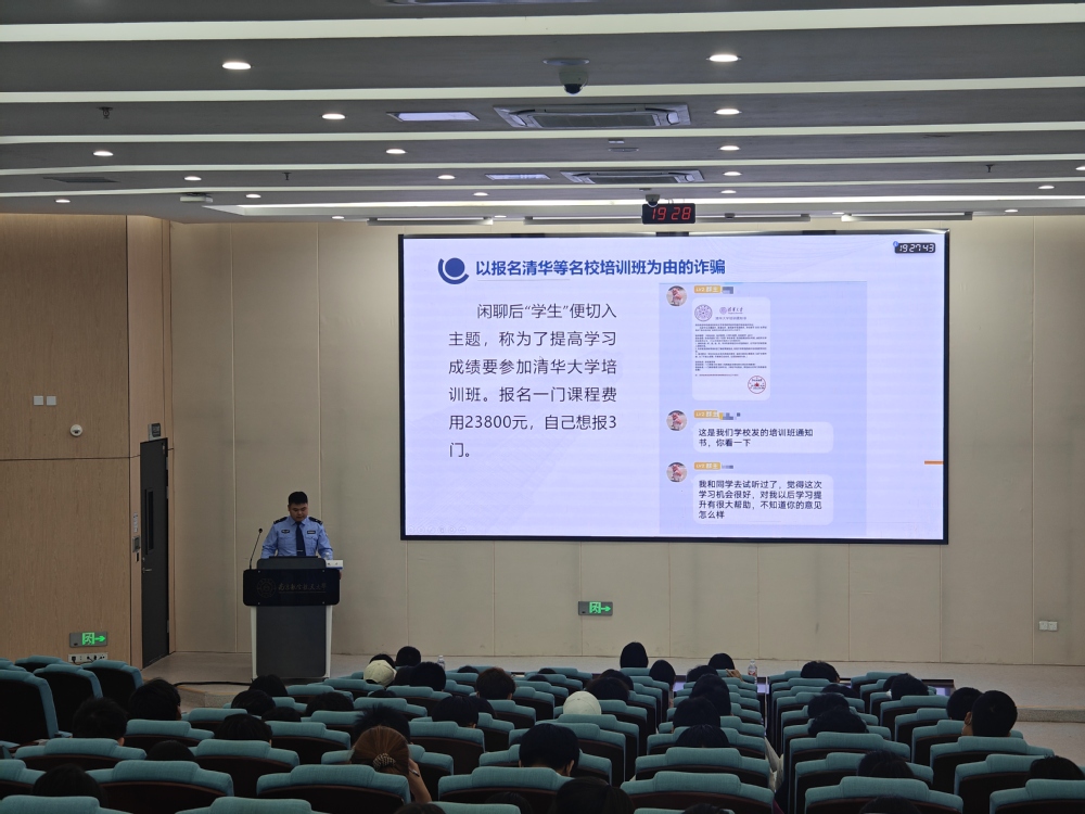 为有效提升学生对电信网络诈骗的识别和防范能力,营造安全和谐的校园环境,5月14日晚,成人漫画 在天目湖校区牧星楼T2110教室举办“天目护航”防诈安全教育专题讲座。古县派出所民警兼成人漫画 法制辅导员鲍力主讲,学院党委副书记王亚鹏、2024级辅导员赵美婷、迪丽以及2024级全体本、预科生到场参加。