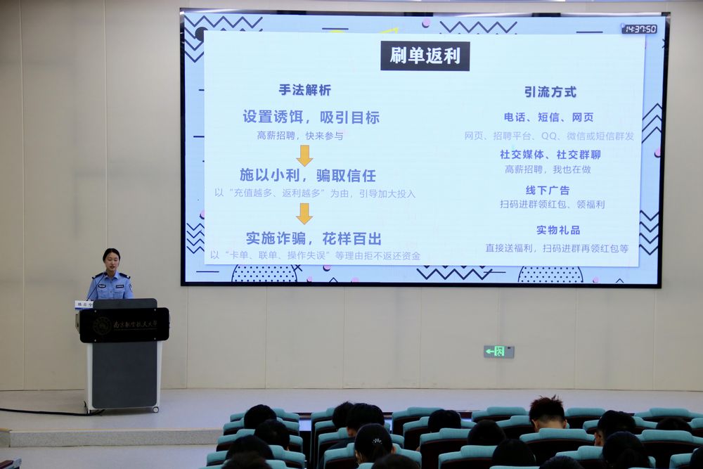 为进一步增强全体师生的安全防范意识,提高反诈骗能力,9月26日,成人漫画 在天目湖校区牧星楼T2108报告厅举办防电诈安全教育专题讲座。本次讲座特邀溧阳市古县派出所滕若兮警官以防范诈骗为主题,为师生讲解反诈安全知识。全体2024级本科生、2025级少数民族预科生到场聆听学习。
